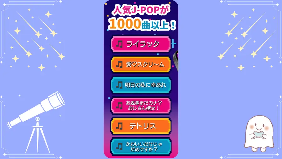 ボカロ、J-POP、アニメ、歌い手の4つのカテゴリーがあります。人気のある楽曲や最新の楽曲まで合計数は1000曲以上に及びます。