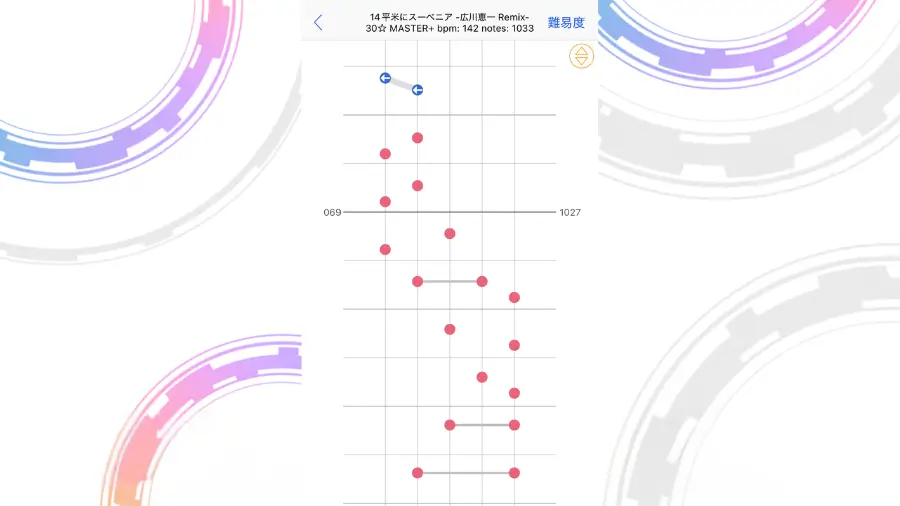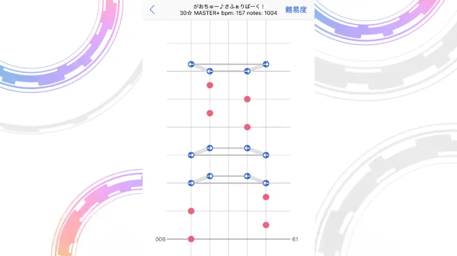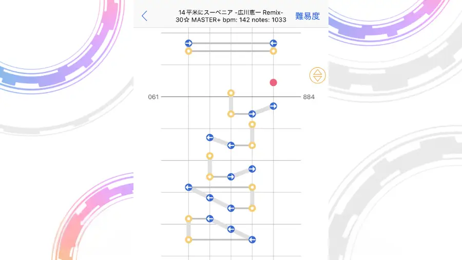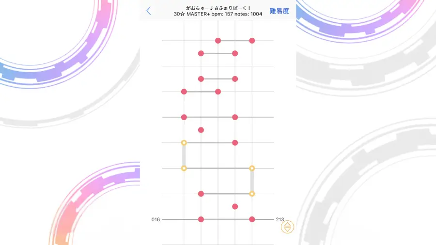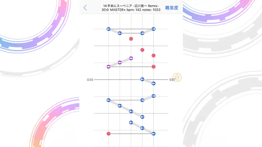 この配置がよく出てくる譜面になりますが、フリックを意識しすぎてノーツを取り損ねることが多発しました。