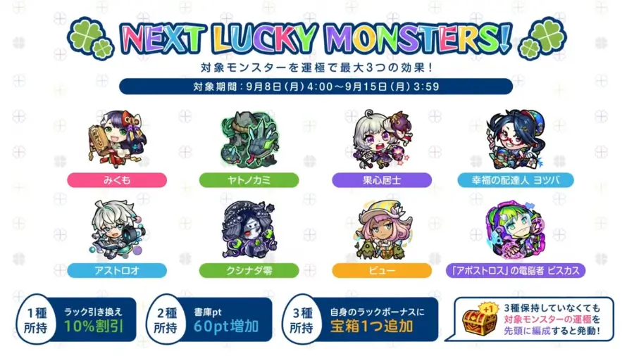 9月8日(月)4:00~9月15日(月)3:59のラッキーモンスターとなります。