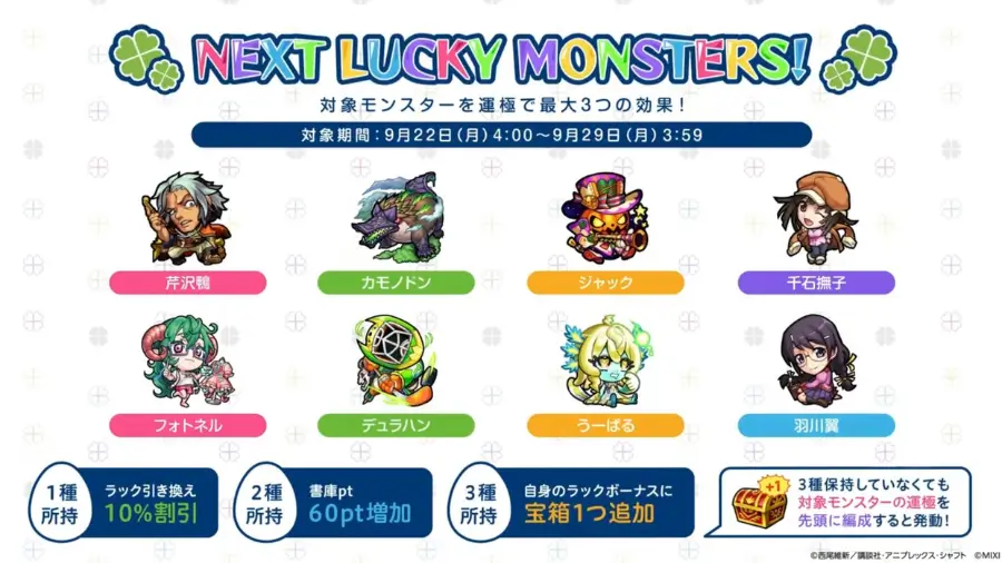 9月1日(月)4:00~9月8日(月)3:59のラッキーモンスターとなります。