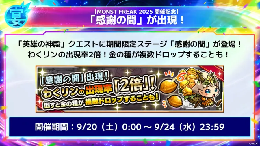 わくリンの出現率が2倍になり、金の種が複数ドロップすることもあります。