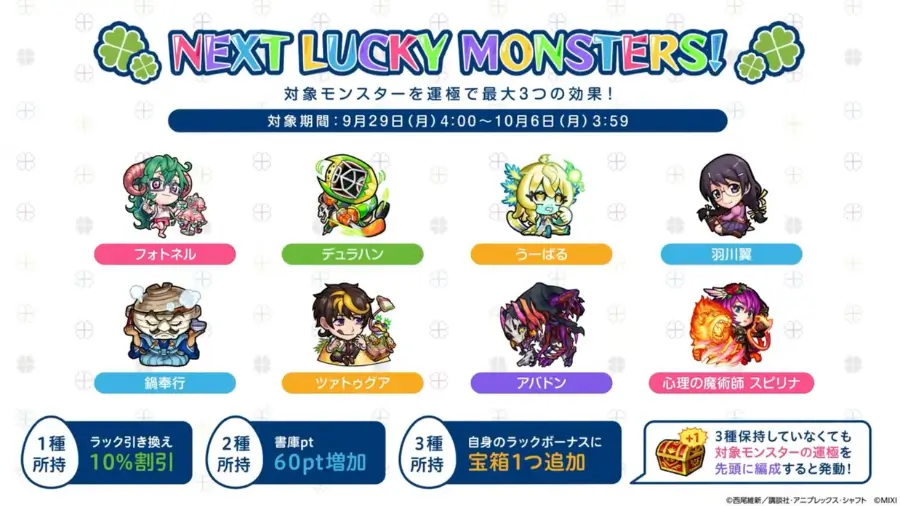 9月29日(月)4:00~10月6日(月)3:59のラッキーモンスターとなります。