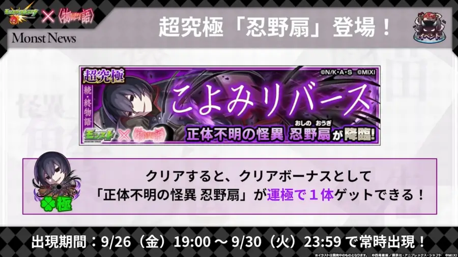 第3超究極として「忍野扇」が登場します。今回の超究極は1回勝つと運極となります。