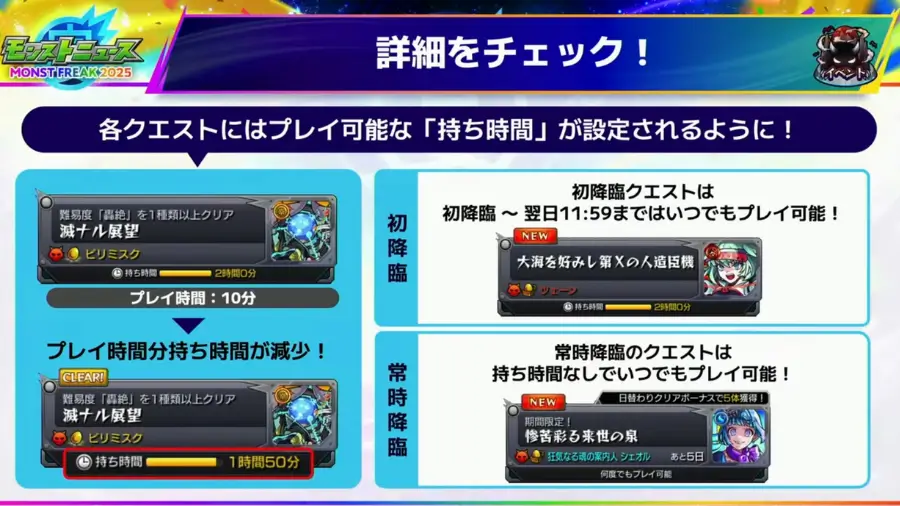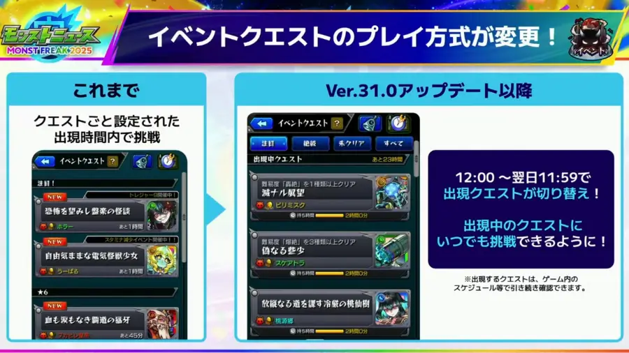 アップデート後は、好きな時間にクエストに挑戦できます。