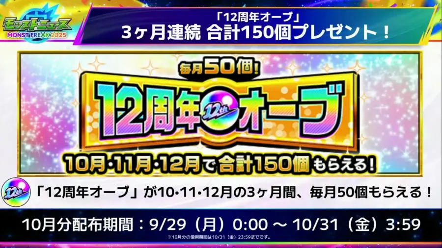 「12周年オーブ」3カ月連続 合計150個プレゼント