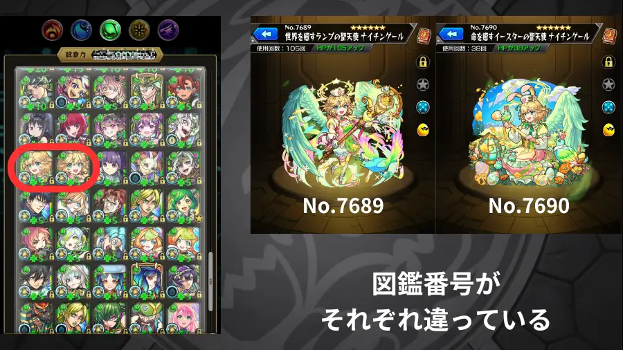 ナイチンゲールが2体とも紋章力対象キャラとして表示されていますが、それぞれの図鑑番号を見てみると、違った番号となっています。
