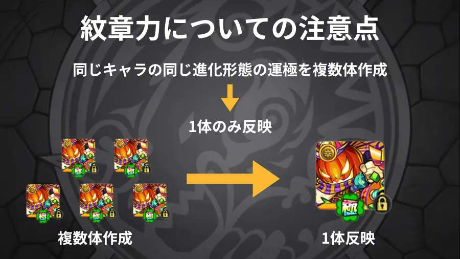 同じキャラの運極を複数体作成した場合、「魂の紋章」では1体のみの反映ですが、「運極ボーナス」では作成した分だけ加算されます。