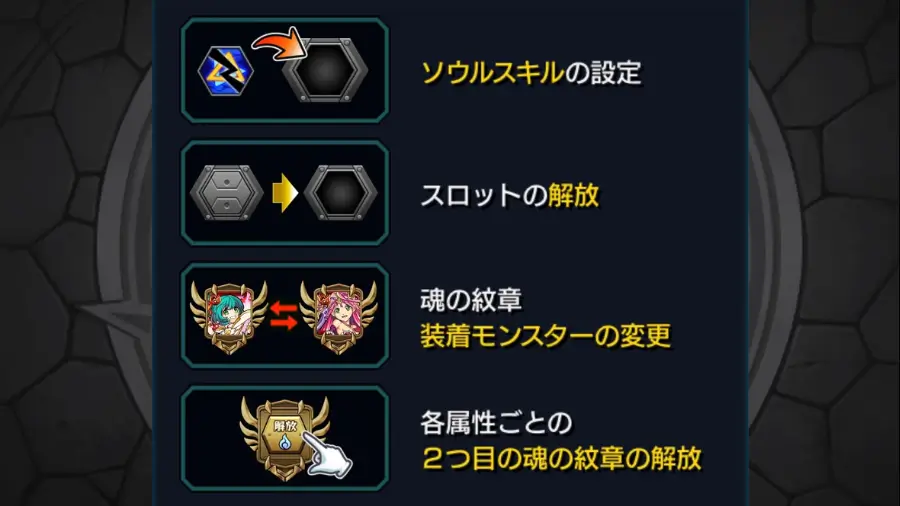 キャラがどのように強化されるかは、魂の紋章にセットしたソウルスキルによって決まります。