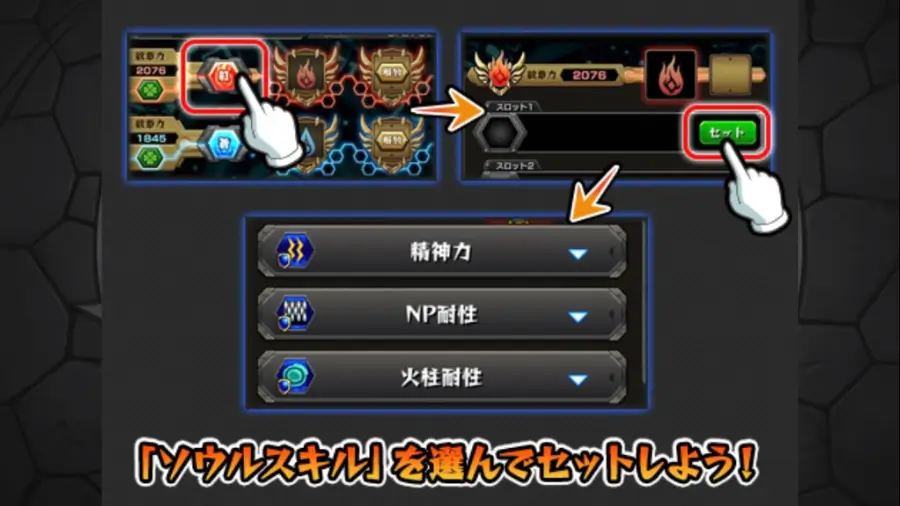 魂気があっても紋章力が低かった場合、紋章力が高くても魂気がない場合は、ソウルスキルをセットできません。