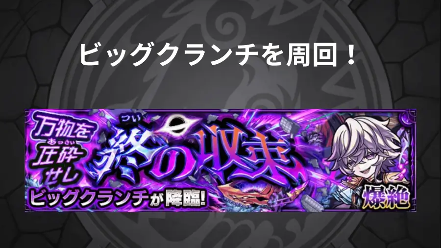 闇属性のビッグクランチを周回しました。運極を作成しつつ周回していたので、1枠目は運極のキャラを採用しています。