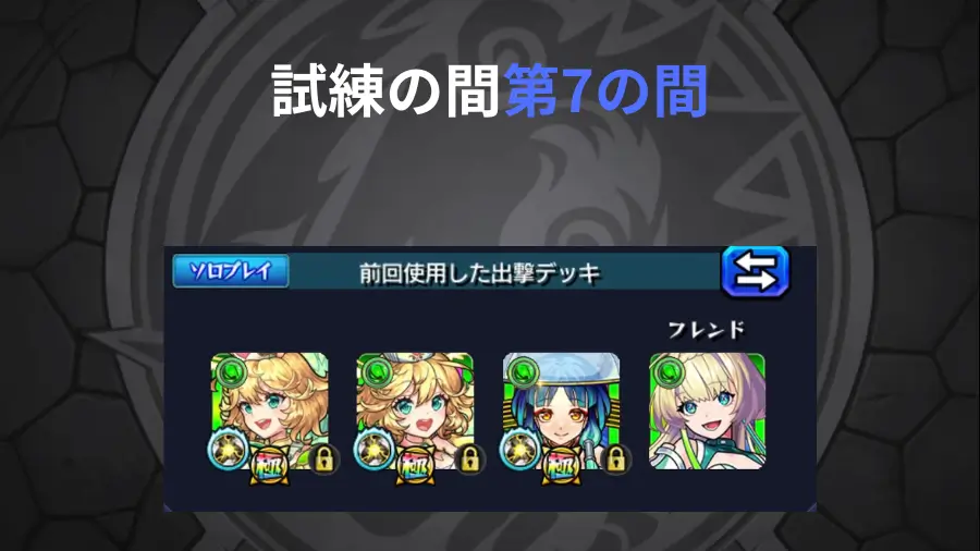 試練の間7で使用した編成とわくわくの実、守護獣は以下のようになります。