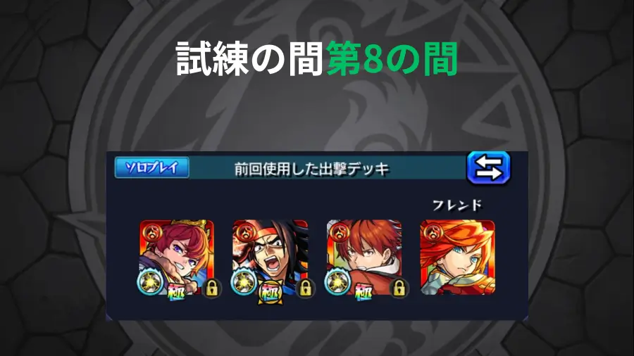 試練の間8で使用した編成とわくわくの実、守護獣は以下のようになります。