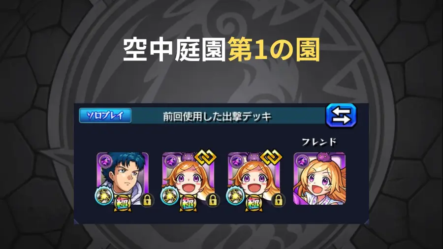 空中庭園1で使用した編成とわくわくの実、守護獣は以下のようになります。