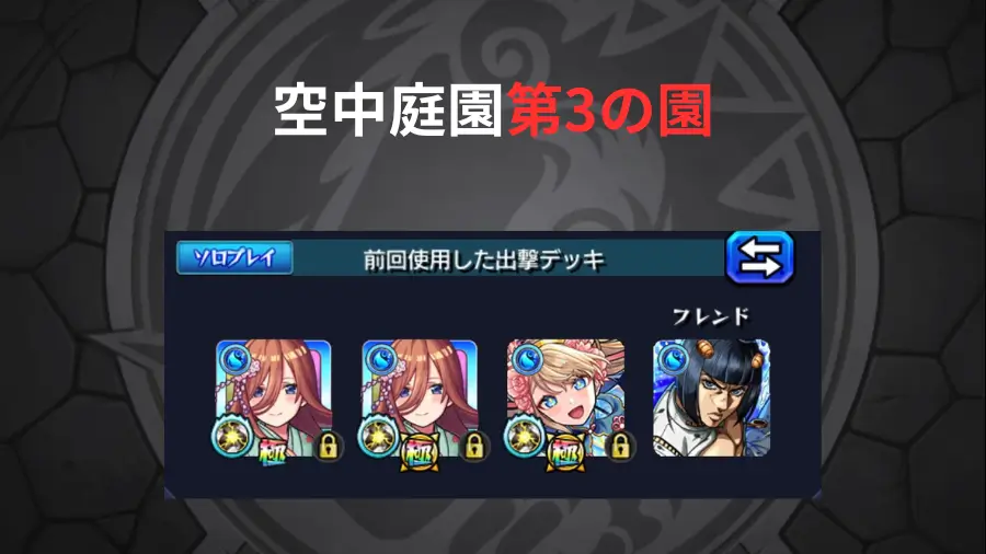 空中庭園3で使用した編成とわくわくの実、守護獣は以下のようになります。