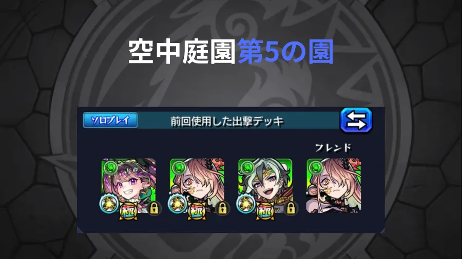 空中庭園5で使用した編成とわくわくの実、守護獣は以下のようになります。