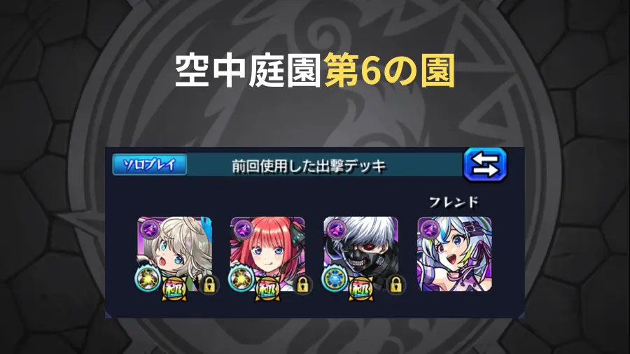 空中庭園6で使用した編成とわくわくの実、守護獣は以下のようになります。