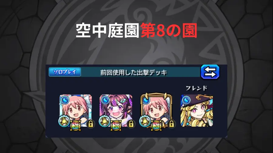空中庭園8で使用した編成とわくわくの実、紋章、守護獣は以下のようになります。