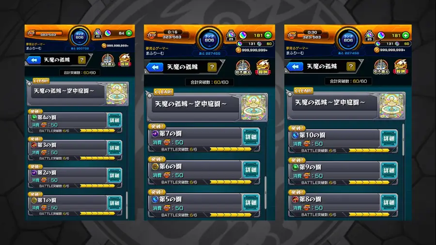 「空中庭園」の各階層のクリア画像になります。初制覇まで時間がかかりました・・・