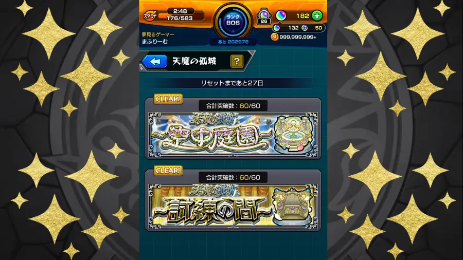 天魔の孤城「試練の間」&「空中庭園」制覇時のスクショ