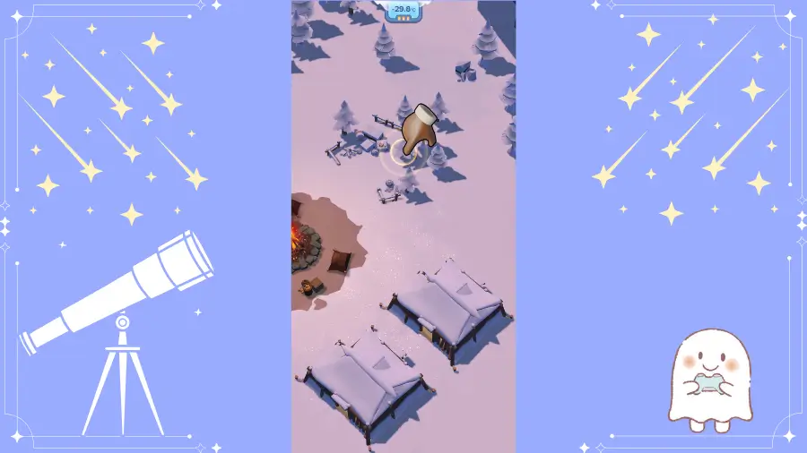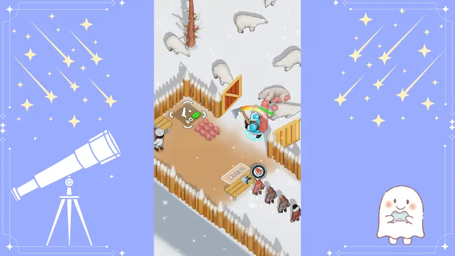 広告で体験できるゲームでは、斧を振り回して白クマを倒す→肉を焼く→人に提供してお金を得る。というゲーム内容でしたが、本編では登場しません。