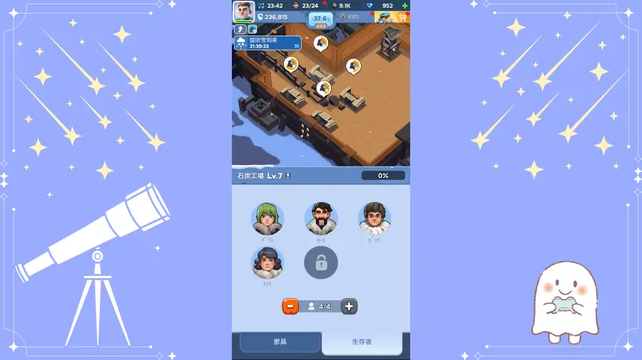 資材集めの施設では、生存者から人員を増やしたり減らしたりできます。