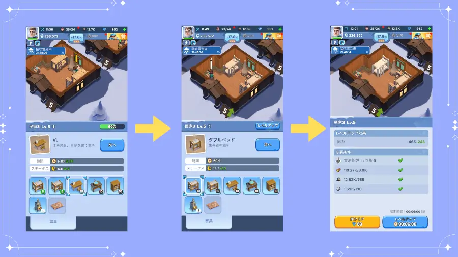 家具の数字が白色で黒い枠になると、レベルアップのボタンを押せるようになる。