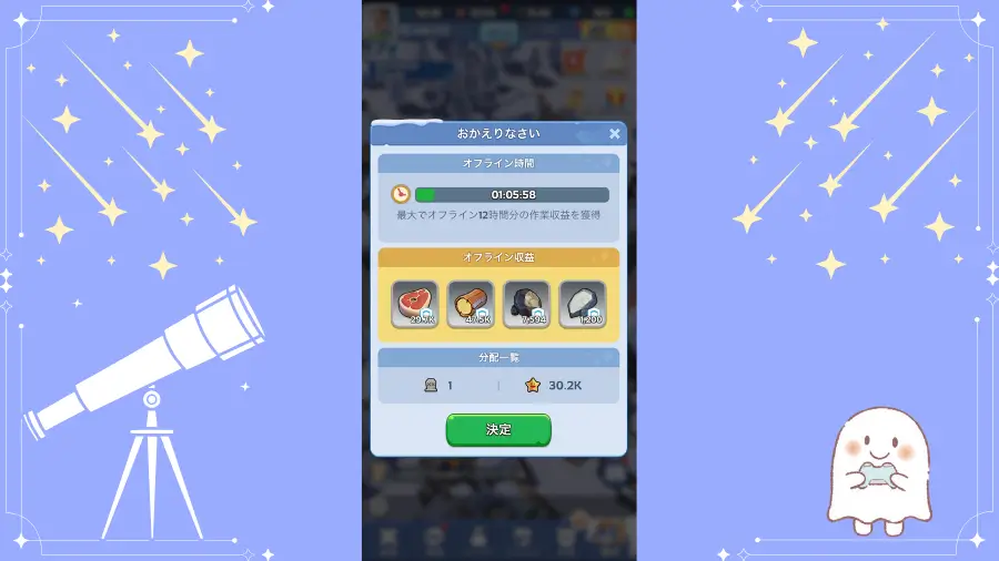 ゲームにログインしていなくても、その間に、資源が蓄積されていきます。